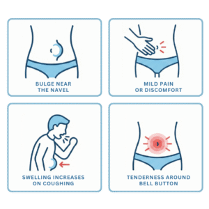 An umbilical hernia develops near the belly button when abdominal tissue pushes through a weak muscle area.